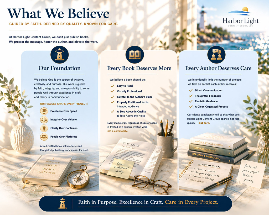 At Harbor Light Content Group, Andy and Cathy lead with a shared commitment to clarity, integrity, and excellence—helping authors bring meaningful messages to life through a publishing process that is both professionally guided and strategically sound.