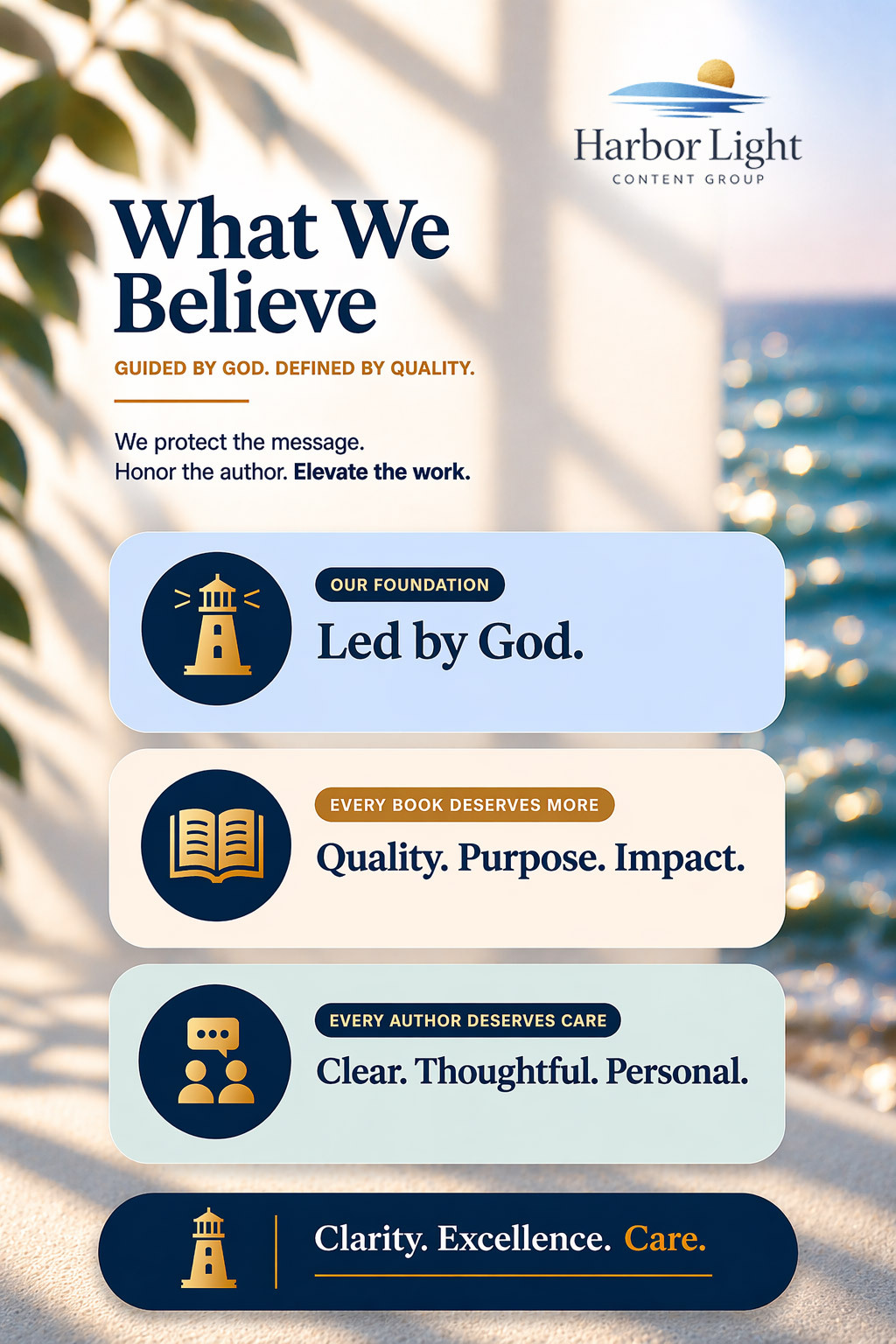 At Harbor Light Content Group, Andy and Cathy lead with a shared commitment to clarity, integrity, and excellence—helping authors bring meaningful messages to life through a publishing process that is both professionally guided and strategically sound.